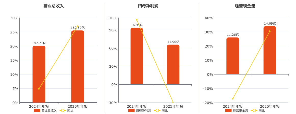 公司营业总收入为187.59亿元。归母净利润为11.90亿元,较去年同报告期归母净利润减少5.04亿元,同比较去年同期下降29.77%。经营活动现金净流入为14.69亿元。