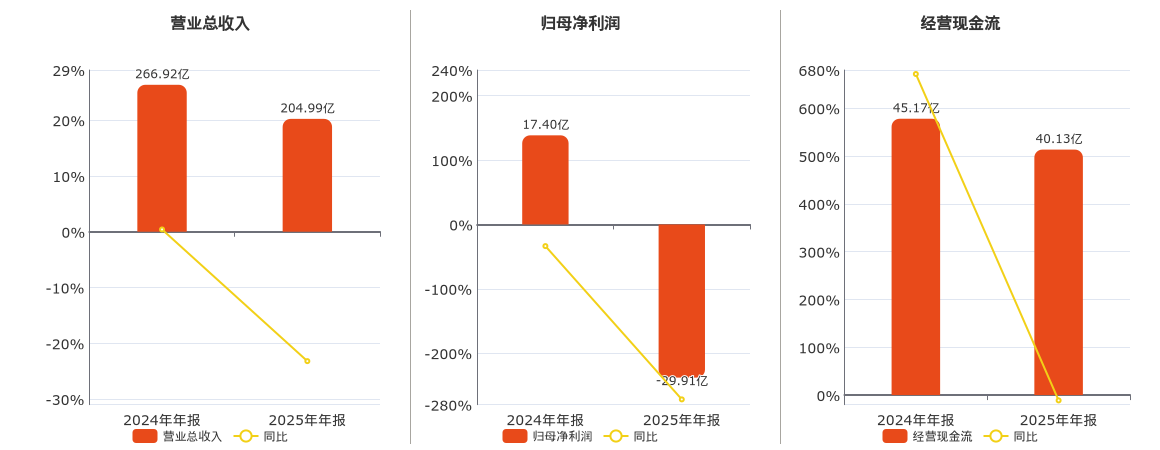 公司营业总收入为204.99亿元,较去年同报告期营业总收入减少61.94亿元,同比较去年同期下降23.20%。归母净利润为-29.91亿元,较去年同报告期归母净利润减少47.31亿元,同比较去年同期下降271.84%。经营活动现金净流入为40.13亿元,较去年同报告期经营活动现金净流入减少5.04亿元,同比较去年同期下降11.16%。
