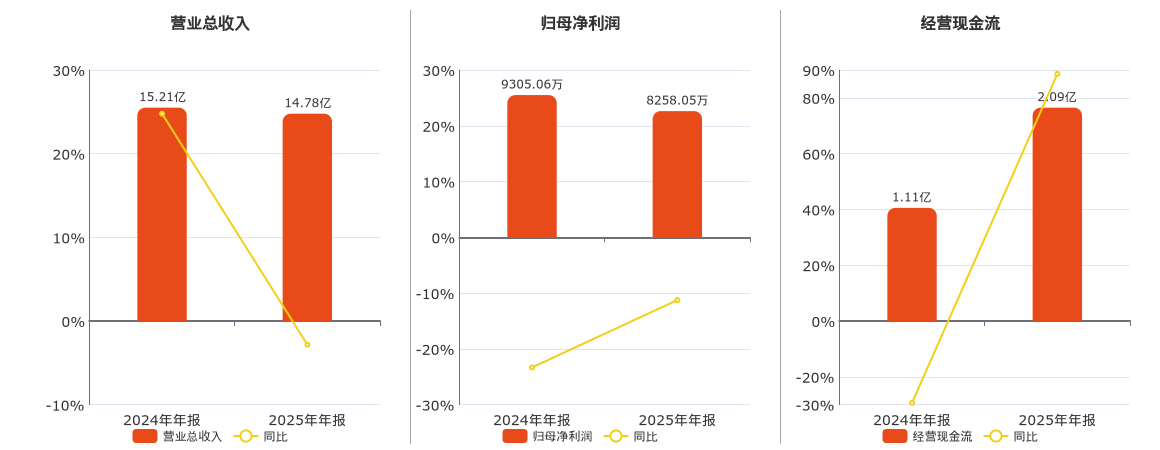 公司营业总收入为14.78亿元,较去年同报告期营业总收入减少4307.03万元,同比较去年同期下降2.83%。归母净利润为8258.05万元,较去年同报告期归母净利润减少1047.01万元,同比较去年同期下降11.25%。经营活动现金净流入为2.09亿元。