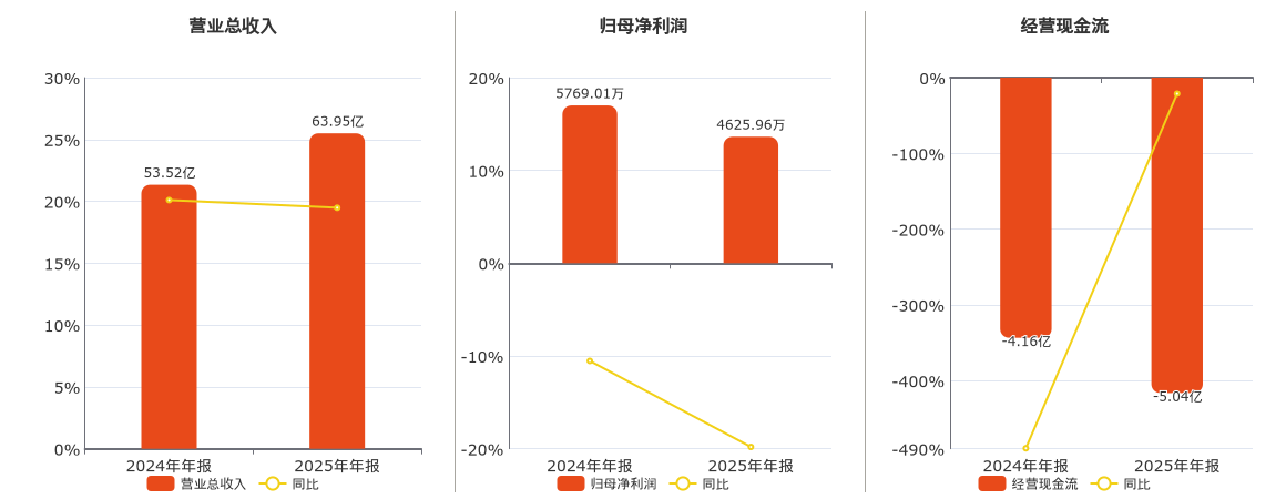 公司营业总收入为63.95亿元。归母净利润为4625.96万元,较去年同报告期归母净利润减少1143.05万元,同比较去年同期下降19.81%。经营活动现金净流入为-5.04亿元,较去年同报告期经营活动现金净流入减少8831.07万元。