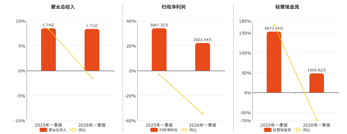 公司营业总收入为1.71亿元,较去年同报告期营业总收入减少255.91万元,同比较去年同期下降1.47%。归母净利润为2003.54万元,较去年同报告期归母净利润减少1063.78万元,同比较去年同期下降34.68%。经营活动现金净流入为1909.82万元,较去年同报告期经营活动现金净流入减少4163.22万元,同比较去年同期下降68.55%。