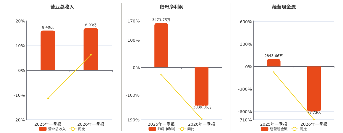 公司营业总收入为8.93亿元。归母净利润为-3039.06万元,较去年同报告期归母净利润减少6512.80万元,同比较去年同期下降187.49%。经营活动现金净流入为-1.73亿元,较去年同报告期经营活动现金净流入减少2.02亿元,同比较去年同期下降709.42%。