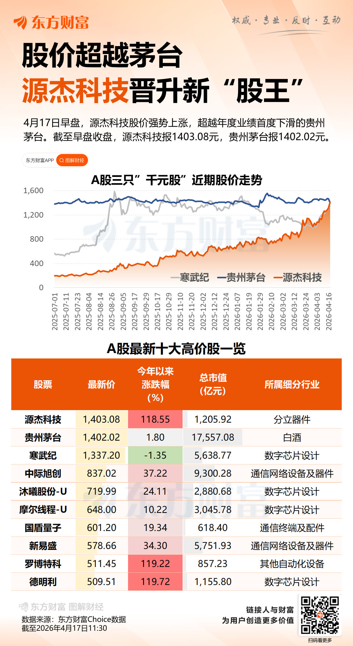 超越茅台 源杰科技晋升新“股王”!一图速览A股最新十大高价股