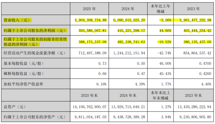 虽然归母净利润从2023年的4.03亿元飙升至5.94亿元,但是公司的真实盈利能力在2024年短暂反弹后,2025年再次回落,扣非净利润较2024年的4.82亿元下降了近1亿元。经营现金流更是创下近三年最低。