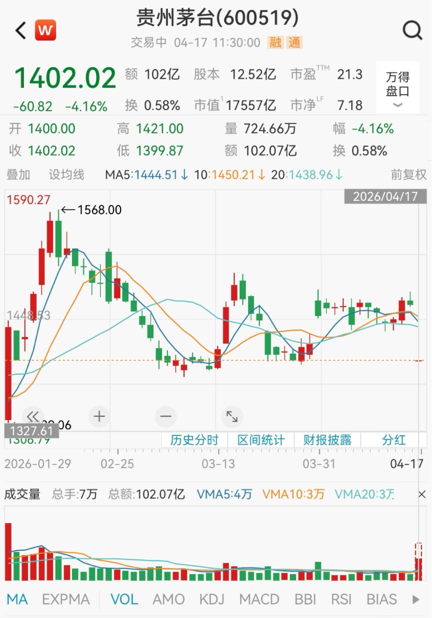 早盘白酒龙头贵州茅台低开超4%,触及1400元整数关口。