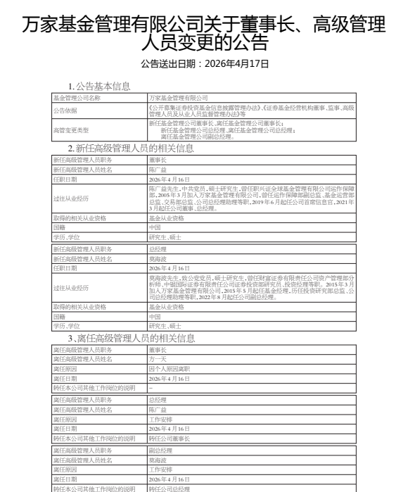 上证报中国证券网讯(记者王彭)公募基金行业再现重磅人事变动。4月17日,万家基金发布公告,执掌公司逾十年的董事长方一天离任,公司现任总经理陈广益将接任董事长,知名基金经理、现任公司副总经理莫海波则升任总经理。