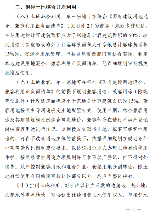 单一宗地可在符合《国有建设用地混合、兼容利用正负面清单》的前提下规划兼容用途,兼容用途(除配套设施外)计容建筑面积应小于宗地总计容建筑面积的15%。