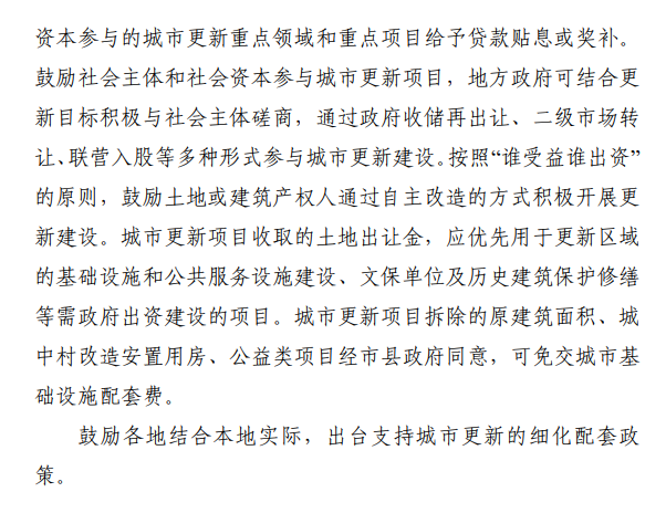 鼓励社会主体和社会资本参与城市更新项目,地方政府可结合更新目标积极与社会主体磋商,通过政府收储再出让、二级市场转让、联营入股等多种形式参与城市更新建设。