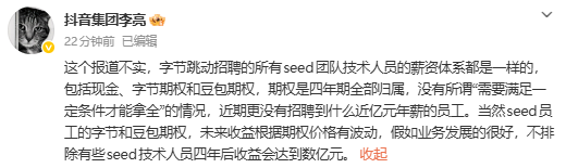 李亮表示,相关信息不实,字节跳动招聘的所有seed团队技术人员的薪资体系都是一样的,包括现金、字节期权和豆包期权,期权是四年期全部归属,没有所谓“需要满足一定条件才能拿全”的情况,近期更没有招聘到什么近亿元年薪的员工。当然seed员工的字节和豆包期权,未来收益根据期权价格有波动,假如业务发展的很好,不排除有些seed技术人员四年后收益会达到数亿元。