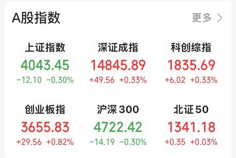 截至午间休市,上证指数报4043.45点,跌0.30%;深证成指涨0.33%,创业板指涨0.82%,科创综指涨0.33%。沪深两市半日成交额1.58万亿元,较前一日同期放量1186亿元。
