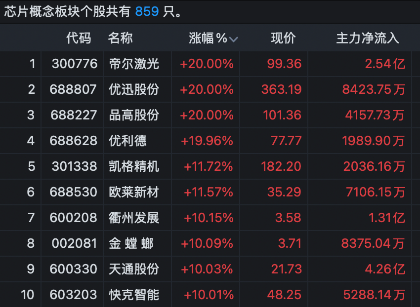 芯片产业链早间全线走强,先进封装、第三代半导体、存储芯片、光刻机等细分板块纷纷放量上扬。品高股份高开后秒速20%涨停,连续第2日封板;优迅股份、帝尔激光等也纷纷“20cm”涨停,欧莱新材、金螳螂等批量涨停或涨超10%。