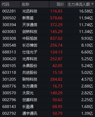 Wind实时监测数据显示,截至午间收盘,通信行业获得逾77亿元主力资金净流入,其中光迅科技、新易盛、天孚通信、剑桥科技4股均获得超10亿元净流入,中际旭创、长芯博创、仕佳光子等也获得超6亿元净流入。