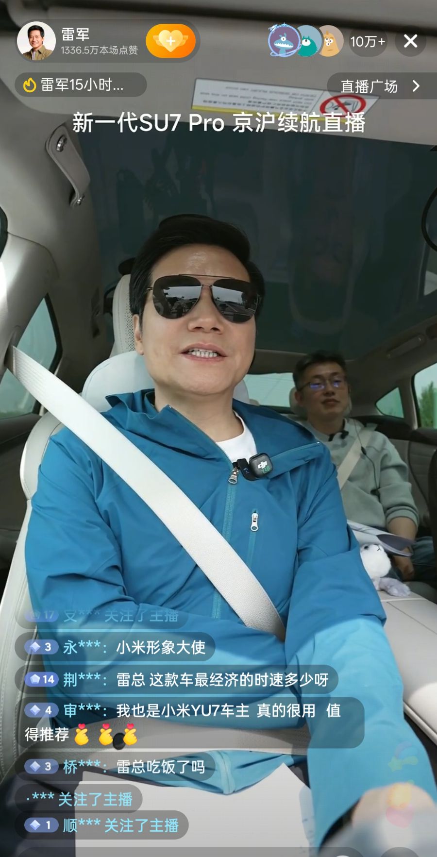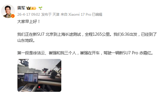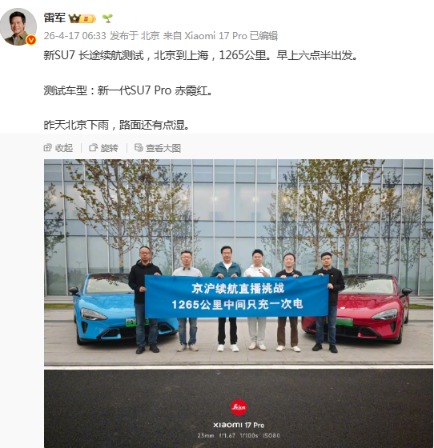 4月17日早上6点半,小米创办人、董事长兼CEO雷军乘坐新一代SU7 Pro,开启北京到上海1265公里只充一次电挑战直播,预计本次挑战将持续15小时,将在今晚21:30左右抵达上海。
