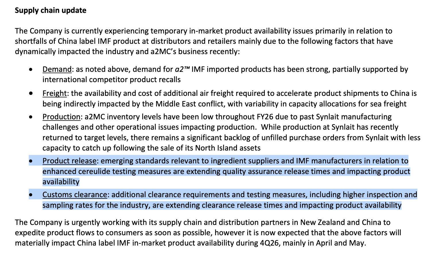 “近期全球各国监管机构均提升了针对奶粉制造商及原料供应商的检测要求和标准。中国政府也强化了对婴幼儿配方奶粉产品的检验措施,涉及进口产品的报关和检验周期因此延长,在一定程度上影响了产品供应周期。”