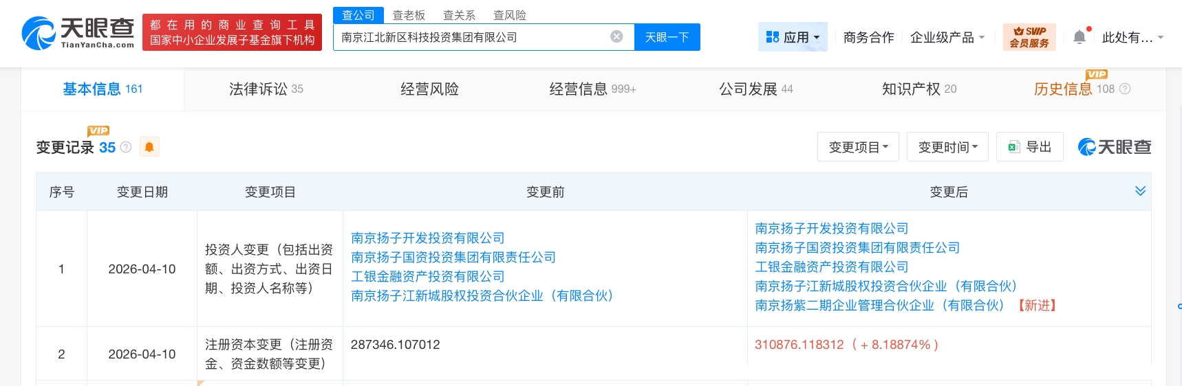 天眼查App显示,近日,南京江北新区科技投资集团有限公司发生工商变更,注册资本由约28.7亿元增至约31.1亿元,增幅约8%。同时,新增南京扬紫二期企业管理合伙企业(有限合伙)为股东。南京江北新区科技投资集团有限公司成立于2012年7月,法定代表人为高亮,经营范围含技术咨询及售后服务、科学技术成果转让、技术研发机构办公用房的出租及物业管理等。股东信息显示,该公司现由南京扬子国资投资集团有限责任公司、南京扬子江新城股权投资合伙企业(有限合伙)、工银金融资产投资有限公司及上述新增股东等共同持股。