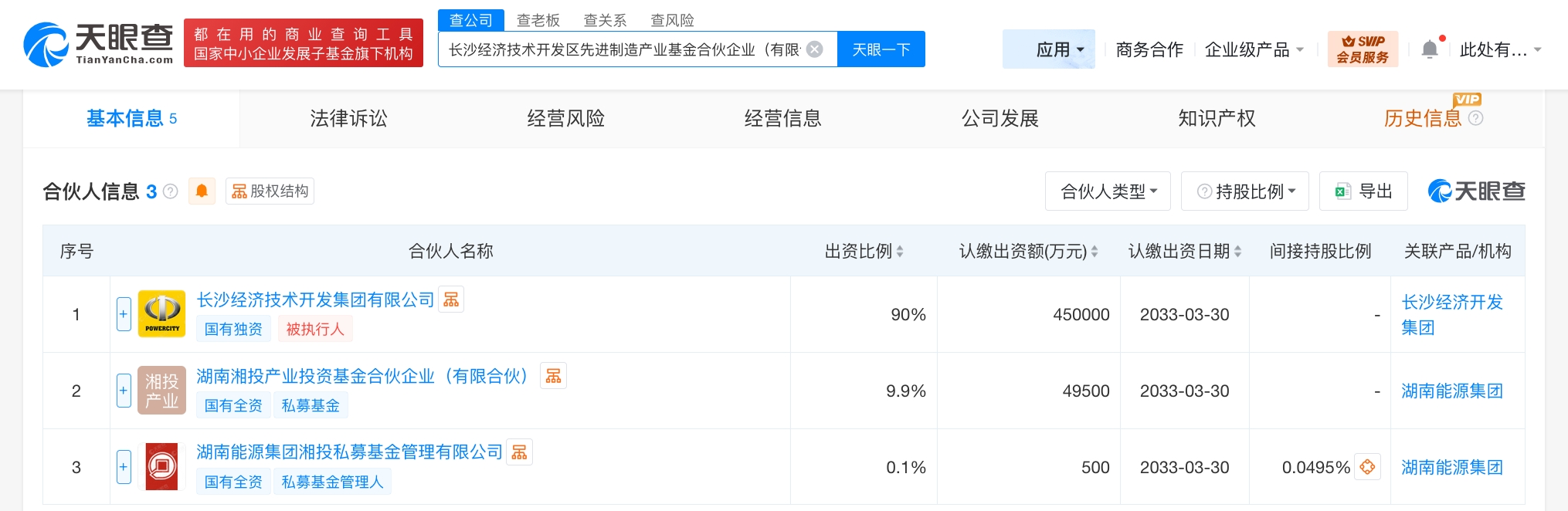 天眼查工商信息显示,近日,长沙经济技术开发区先进制造产业基金合伙企业(有限合伙)成立,执行事务合伙人为湖南能源集团湘投私募基金管理有限公司,出资额50亿元人民币,经营范围为以私募基金从事股权投资、投资管理、资产管理等活动,创业投资。合伙人信息显示,该基金由长沙经济技术开发集团有限公司、湖南湘投产业投资基金合伙企业(有限合伙)、湖南能源集团湘投私募基金管理有限公司共同出资。