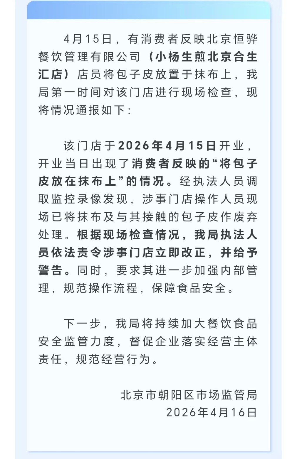 4月16日晚间,北京市朝阳区市场监管局发布通报称,4月15日,有消费者反映北京恒骅餐饮管理有限公司(小杨生煎北京合生汇店)店员将包子皮放置于抹布上,该局第一时间对该门店进行现场检查。