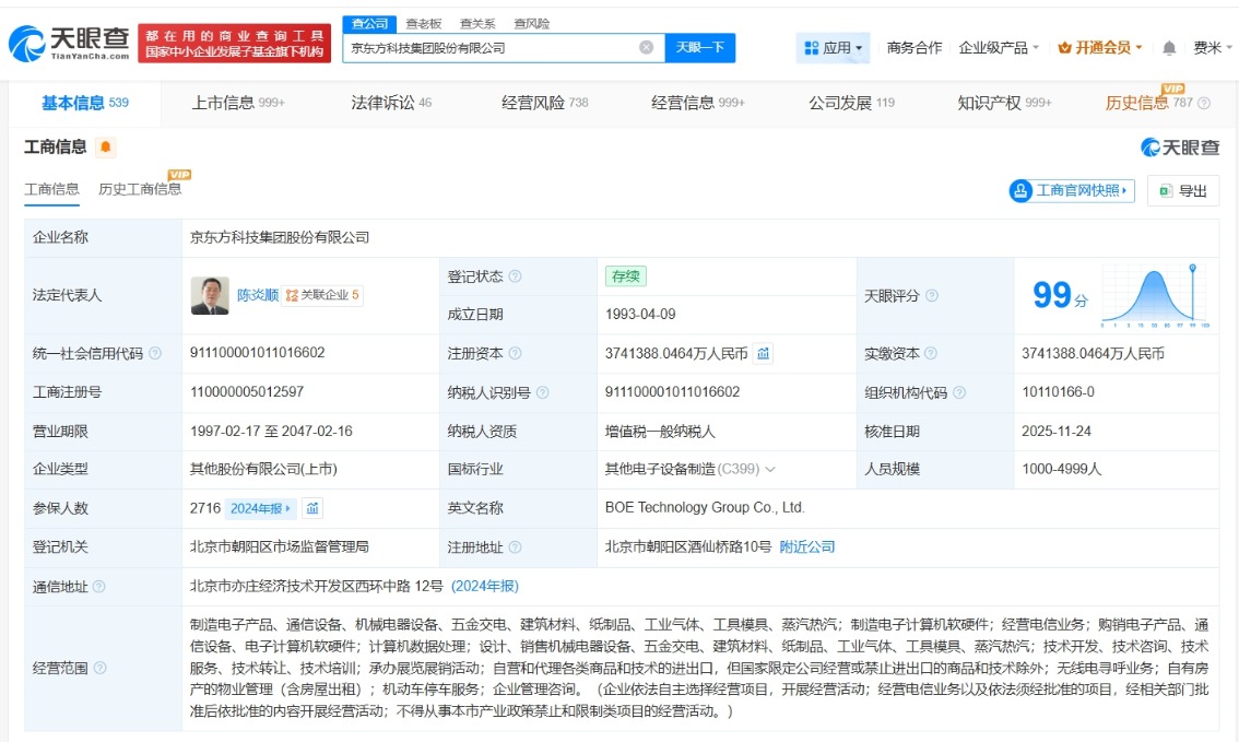 南方财经4月17日电,天眼查知识产权信息显示,近日,京东方科技集团股份有限公司登记“AI工厂”作品著作权,作品类别为美术。该公司成立于1993年4月,法定代表人为陈炎顺,注册资本约374.1亿人民币,经营范围包括制造电子计算机软硬件、经营电信业务、计算机数据处理等,由北京国有资本运营管理有限公司、香港中央结算有限公司、北京京东方投资发展有限公司等共同持股。