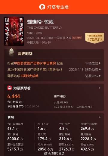 据灯塔专业版实时数据,截至4月17日12时42分,影片《蝴蝶楼·惊魂》票房突破6000万。