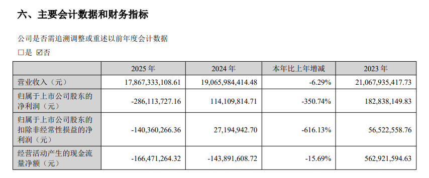 年报显示,泰达股份2025年实现营业收入178.67亿元,同比下降6.29%;归属于上市公司股东的净利润-2.86亿元,同比由盈转亏,降幅达350.74%;扣除非经常性损益后的净利润-1.40亿元,同比大幅下滑616.13%;基本每股收益-0.1941元,同比下降350.74%;加权平均净资产收益率-5.14%,较上年下降7.15个百分点。