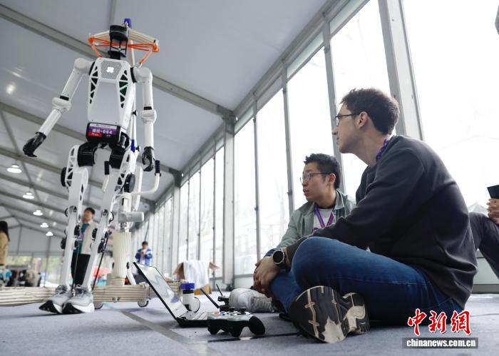 4月16日,工作人员在机器人大本营工作。据悉,2026北京亦庄人形机器人半程马拉松将于4月19日鸣枪开跑。中新社记者韩海丹摄