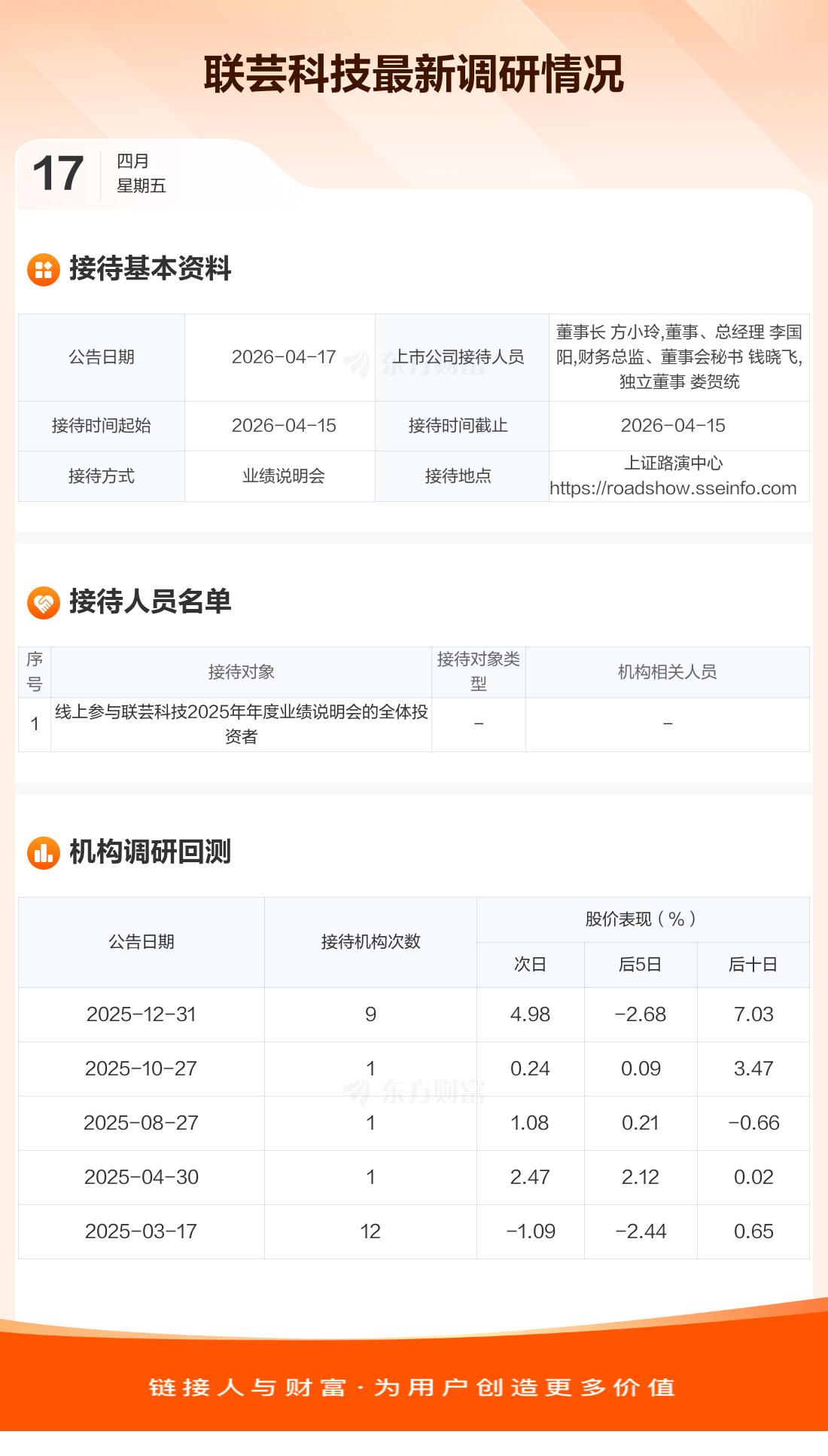 联芸科技4月17日公告称,4月15日接待线上参与联芸科技2025年年度业绩说明会的全体投资者调研。接待人员包括董事长 方小玲,董事、总经理 李国阳,财务总监、董事会秘书 钱晓飞,独立董事 娄贺统。