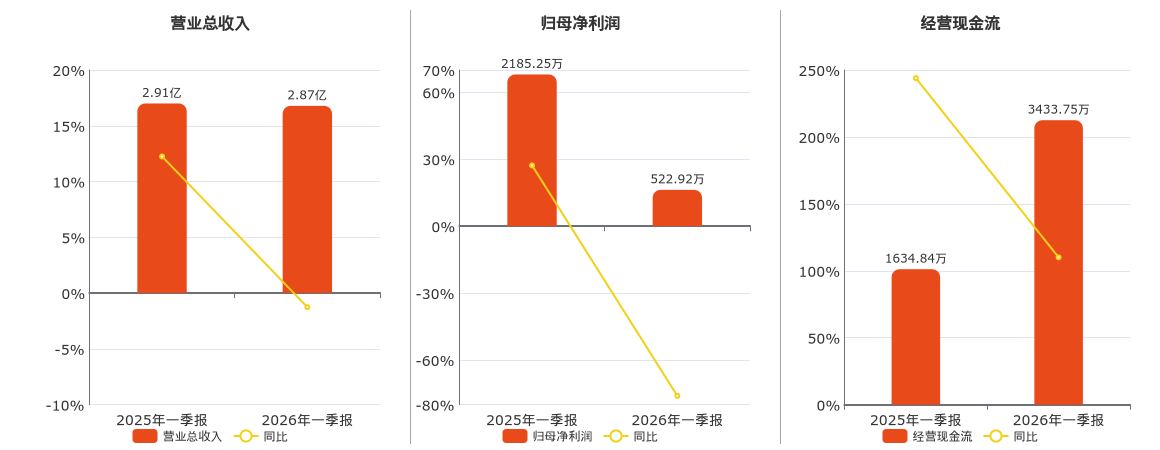 公司营业总收入为2.87亿元,较去年同报告期营业总收入减少388.63万元,同比较去年同期下降1.34%。归母净利润为522.92万元,较去年同报告期归母净利润减少1545.96万元,同比较去年同期下降74.72%。经营活动现金净流入为3433.75万元。