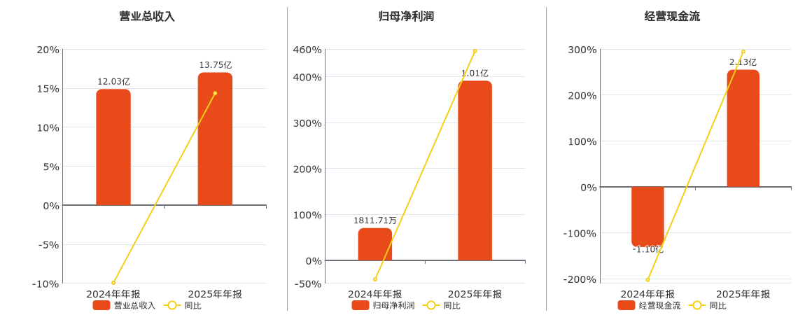公司营业总收入为13.75亿元,较去年同报告期营业总收入增加1.72亿元,同比较去年同期上涨14.34%。归母净利润为1.01亿元,较去年同报告期归母净利润增加8253.79万元,同比较去年同期上涨455.58%。经营活动现金净流入为2.13亿元,较去年同报告期经营活动现金净流入增加3.22亿元。