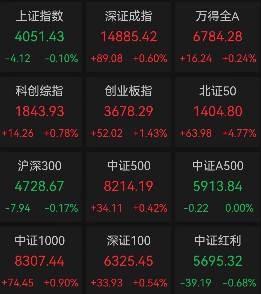 截至收盘,上证指数跌0.10%,报4051.43点;深证成指涨0.60%,报14885.42点;创业板指涨1.43%,报3678.29点;科创综指涨0.78%,报1843.93点;北证50涨4.77%报1404.80点。沪深两市成交额约24255.84亿元,较前一个交易日放量约838.93亿元。