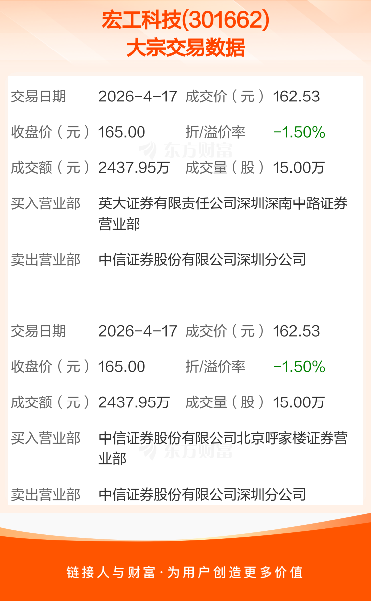 2026年4月17日,宏工科技发生2笔大宗交易,共成交30.00万股,成交金额4875.90万元,占其流通市值比例为0.96%。