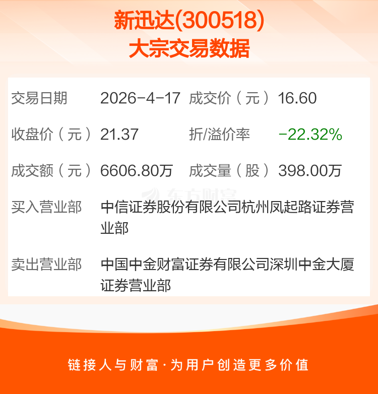 2026年4月17日,新迅达发生1笔大宗交易,共成交398.00万股,成交金额6606.80万元,占其流通市值比例为1.55%。