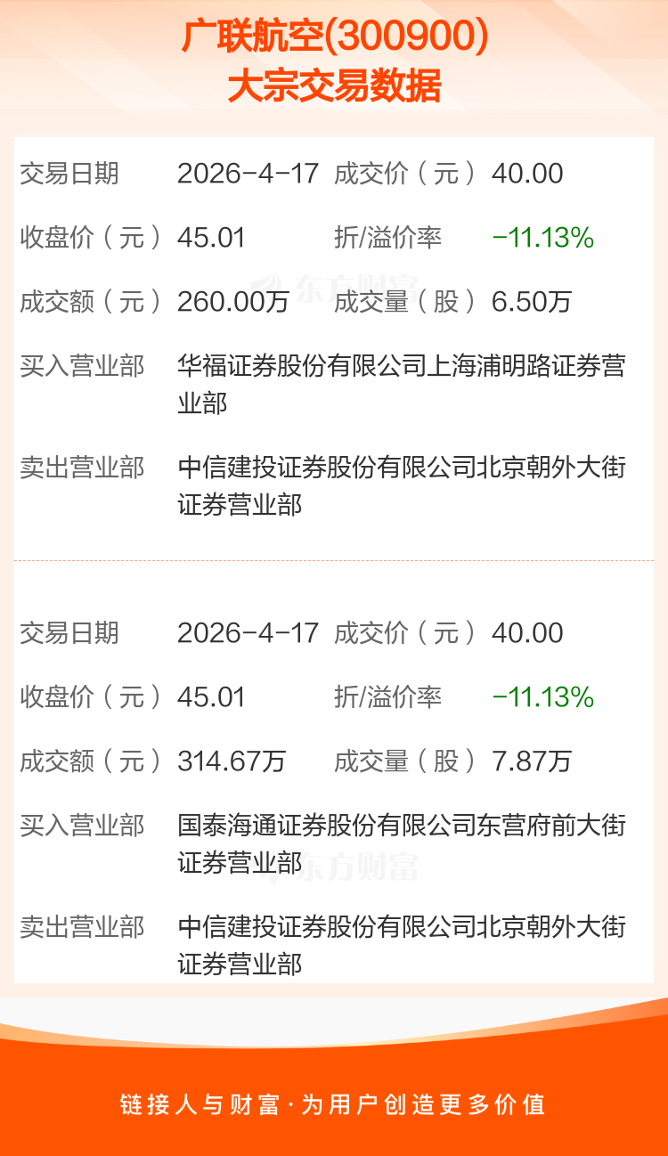 2026年4月17日,广联航空发生2笔大宗交易,共成交14.37万股,成交金额574.67万元,占其流通市值比例为0.05%。