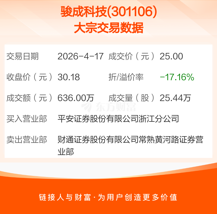 2026年4月17日,骏成科技发生1笔大宗交易,共成交25.44万股,成交金额636.00万元,占其流通市值比例为0.21%。