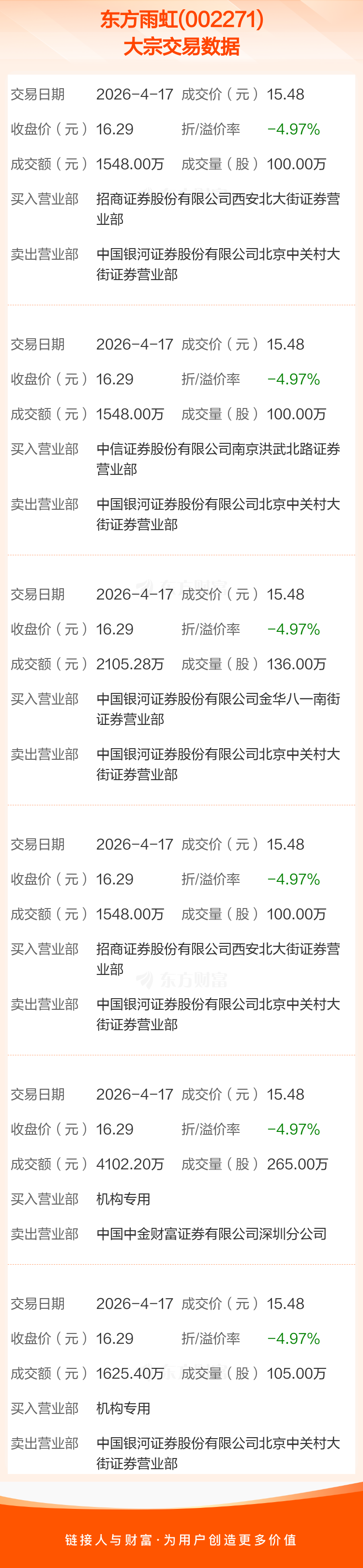 2026年4月17日,东方雨虹发生6笔大宗交易,共成交806.00万股,成交金额1.25亿元,占其流通市值比例为0.40%。