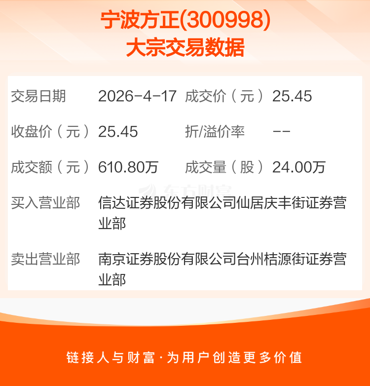 2026年4月17日,宁波方正发生1笔大宗交易,共成交24.00万股,成交金额610.80万元,占其流通市值比例为0.22%。