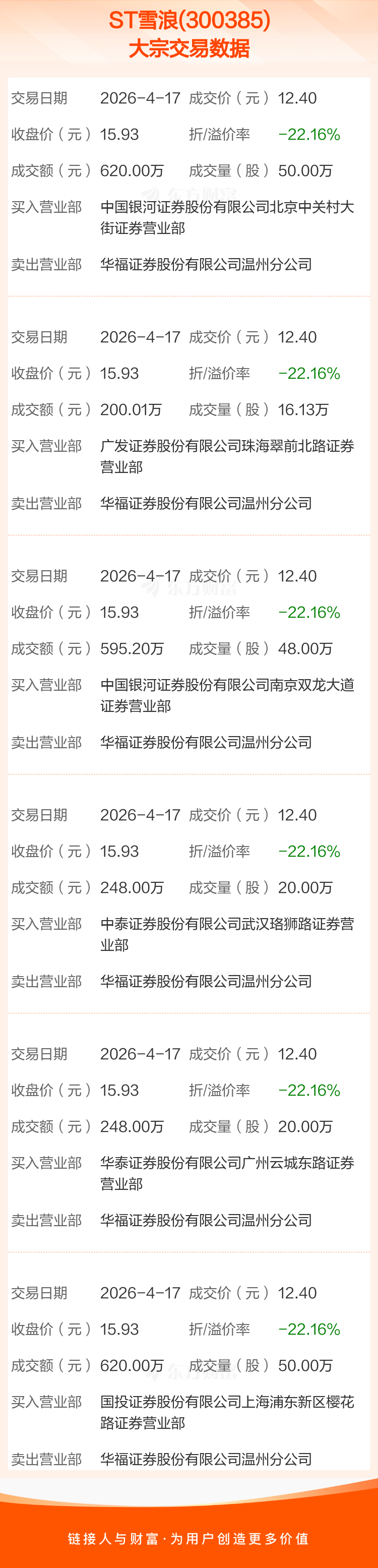 大宗交易:ST雪浪成交2531.21万元,折价22.16%(4-17)
