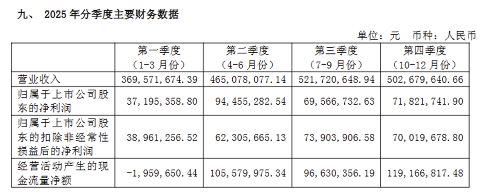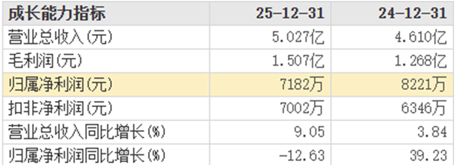 从季度数据看,盈利恶化趋势更为明显。2025年第四季度,公司实现营收5.03亿元,同比增长9.05%,但归母净利润仅7182.17万元,同比大幅下滑12.63%,在行业传统旺季出现“量增利减”,进一步印证公司盈利对成本、投资收益的高度敏感,主业抗风险能力薄弱。