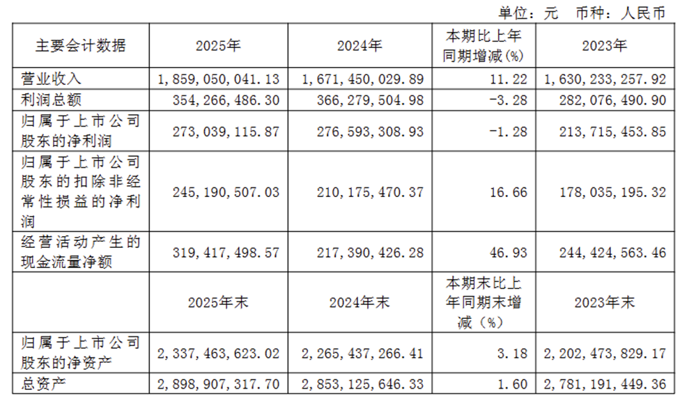 年报数据显示,公司全年实现营业收入18.59亿元,同比增长11.22%,但归母净利润仅2.73亿元,同比下滑1.28%,呈现典型的增收不增利态势。
