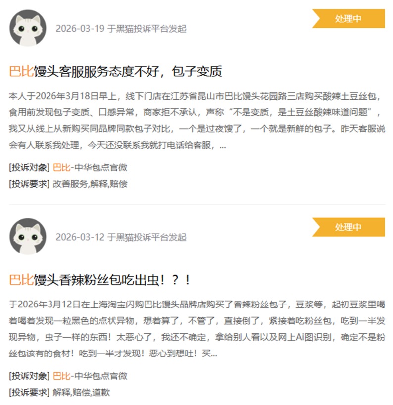 食品安全是餐饮企业的生命线,但巴比食品的品控体系却频频失守。黑猫投诉等公开平台显示,2025年公司相关投诉量居高不下,涉及馒头变质、馅料异物、食用后肠胃不适等问题屡见不鲜。从外卖平台到线下门店,从产品变质到客服推诿,多起食安事件暴露了公司“中央工厂+加盟”模式下的品控漏洞:总部对终端门店运输、储存、销售环节管控不足,加盟门店为降低成本违规操作,品控标准执行不到位等问题突出。对于一家以“标准化、工业化”为核心竞争力的上市食品企业而言,频发的食安问题不仅损害品牌口碑,更面临监管处罚与消费者信任崩塌的双重风险。