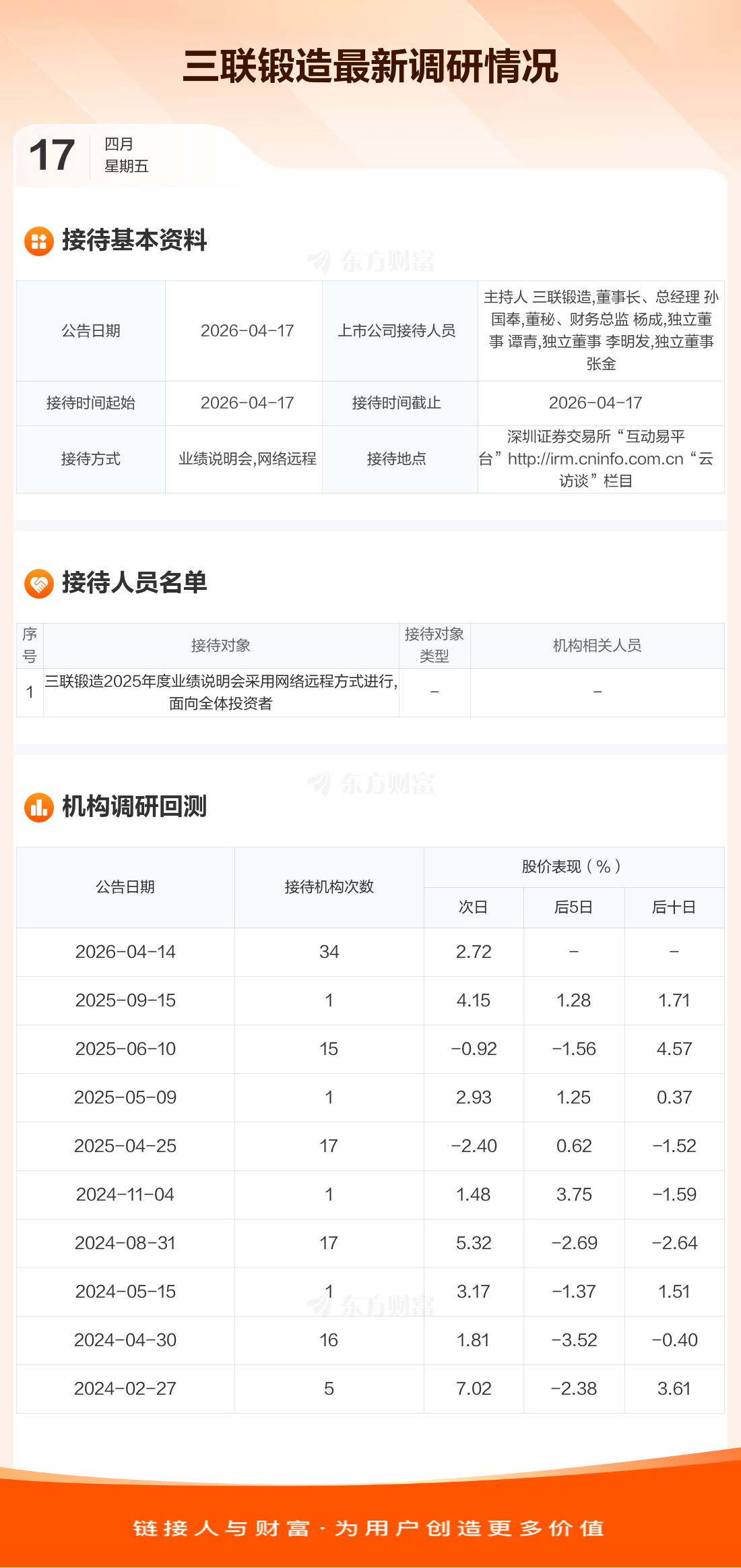 三联锻造4月17日公告称,4月17日接待三联锻造2025年度业绩说明会采用网络远程方式进行,面向全体投资者调研。接待人员包括主持人 三联锻造,董事长、总经理 孙国奉,董秘、财务总监 杨成,独立董事 谭青,独立董事 李明发,独立董事 张金。