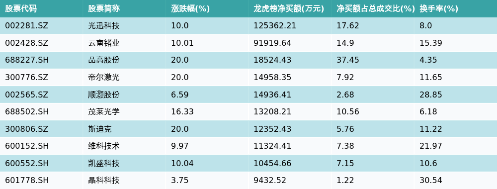 南财智讯4月17日电,盘后数据显示,因当日异动登上龙虎榜的个股中,资金净买入最多的前三位分别是光迅科技(002281.SZ)、云南锗业(002428.SZ)与品高股份(688227.SH)。其中排名第一的光迅科技净买额达12.54亿元,占总成交金额的17.62%。光迅科技当日收盘上涨10.0%,换手率为8.0%,净买入额前10个股详情见下图: