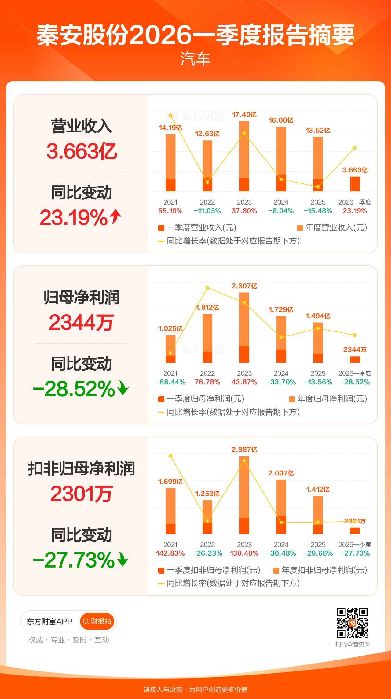 秦安股份4月18日发布2026年一季报显示,公司一季度实现营业收入3.66亿元,同比增长23.19%;归母净利润2344.15万元,同比下滑28.52%;扣非归母净利润2301.38万元,同比下滑27.73%。
