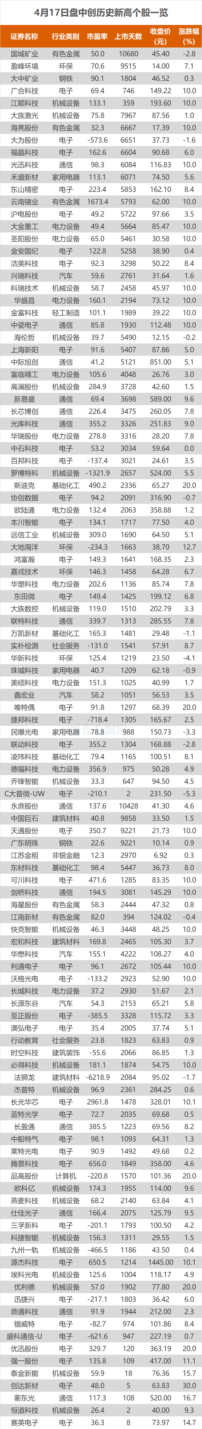 4月17日,A股三大指数今日走势分化,创业板指再创2015年6月以来的近11年新高。截止收盘,沪指跌0.1%,收报4051.43点;深证成指涨0.6%,收报14885.42点;创业板指涨1.43%,收报3678.29点。东方财富Choice数据显示,今日有112只个股盘中股价创历史新高,分别为圣阳股份、中际旭创等。
