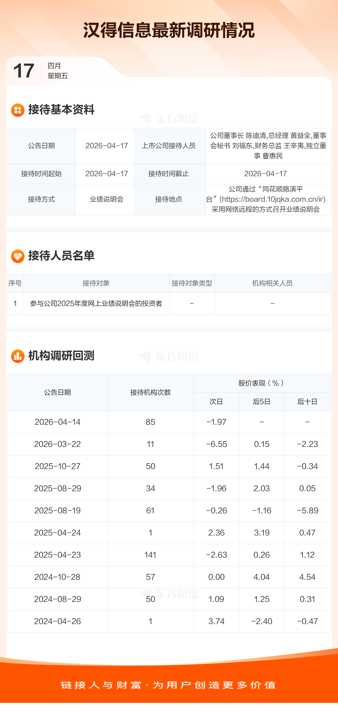 汉得信息4月17日公告称,4月17日接待参与公司2025年度网上业绩说明会的投资者调研。接待人员包括公司董事长 陈迪清,总经理 黄益全,董事会秘书 刘福东,财务总监 王辛夷,独立董事 曹惠民。