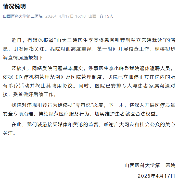 山西医科大学第二医院通报“医生将患者引荐到私立医院就诊”:基本属实 已停止聘用