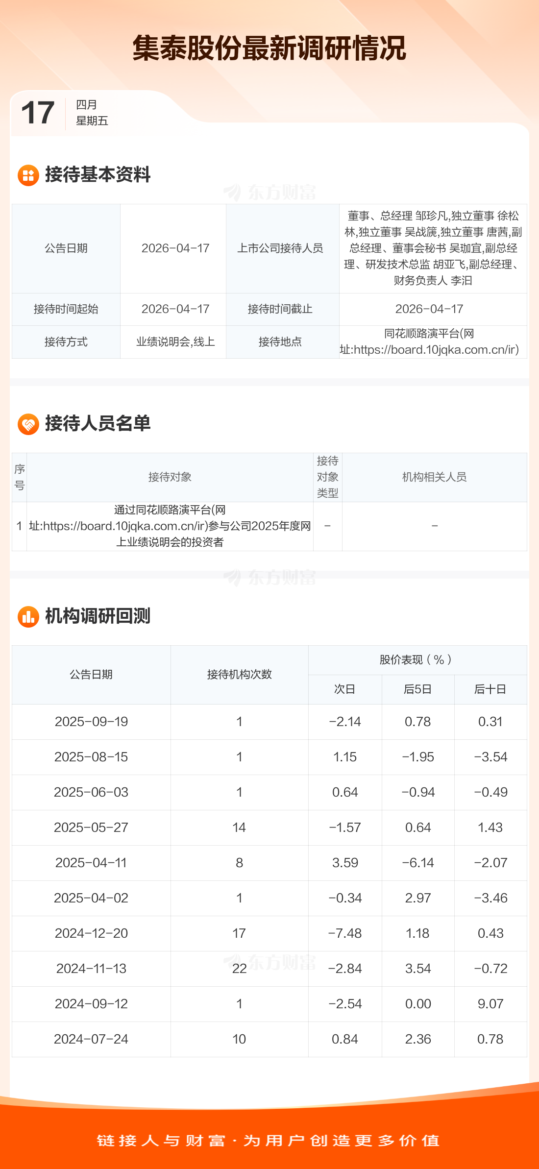 集泰股份4月17日公告称,4月17日接待通过同花顺路演平台(网址:https://board.10jqka.com.cn/ir)参与公司2025年度网上业绩说明会的投资者调研。接待人员包括董事、总经理 邹珍凡,独立董事 徐松林,独立董事 吴战篪,独立董事 唐茜,副总经理、董事会秘书 吴珈宜,副总经理、研发技术总监 胡亚飞,副总经理、财务负责人 李汩。