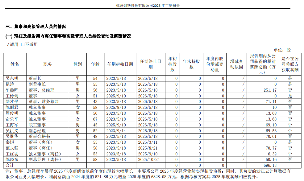 高管薪酬方面,杭钢股份董事、总经理牟晨晖2025年度税前薪酬为251.17万元,较其2024年税前薪酬99.113万元涨了152万元,涨幅达153%!就牟晨晖2025年薪酬出现较大幅增长,年报解释说,主要系公司2025年度经营业绩实现扭亏为盈;同时,其负责的浙江云计算数据有限公司业务大幅增长,利润总额由2024年度的521.86万元增至2025年度的6828.08万元,根据考核方案其2025年度薪酬相应提升。