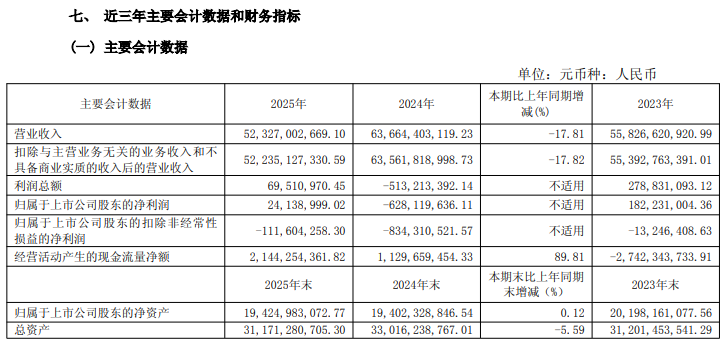 4月17日,杭钢股份(600126)公布2025年年报,公司营业收入为523.27亿元,同比下降17.81%;归母净利润自上年同期亏损6.28亿元成功扭亏,实现归母净利润2414万元;扣非归母净利润自上年同期亏损8.34亿元变为亏损1.12亿元,亏损额有所减少;经营现金流净额为21.44亿元,同比增长89.81%。公司拟向全体股东每10股派发现金红利0.05元(含税)。