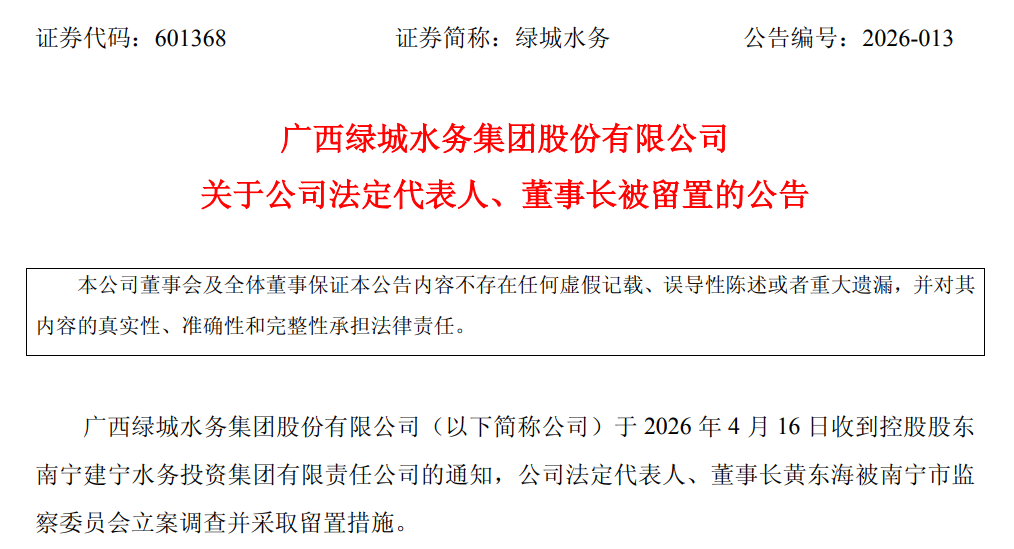 同日,上市公司绿城水务发布公告称,其收到控股股东南宁建宁水务投资集团有限责任公司的通知,公司法定代表人、董事长黄东海被南宁市监察委员会立案调查并采取留置措施。