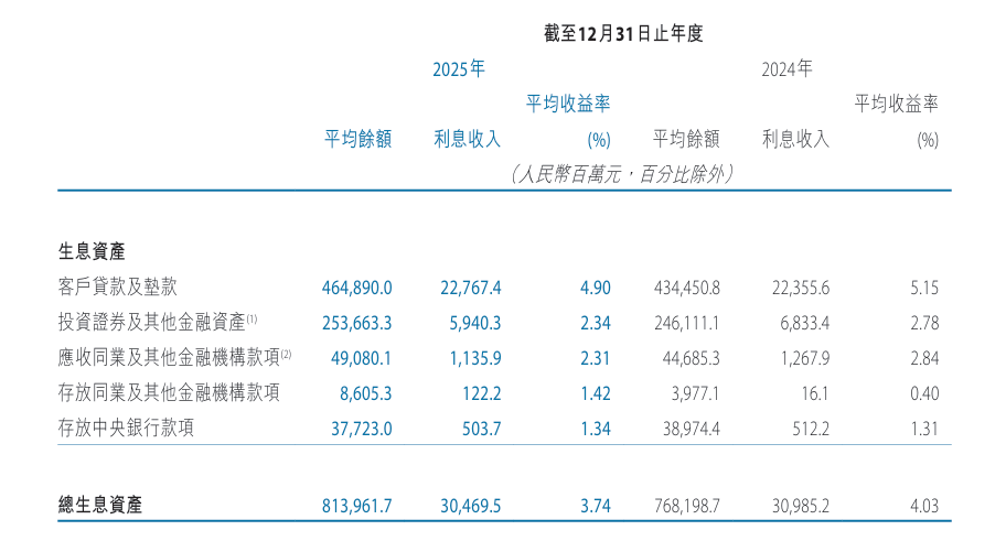 观察资产端数据可见,该行的生息资产平均收益率已从4.03%大幅滑落至3.74%,降幅达29个基点。其中,作为核心资产的“客户贷款及垫款”,其平均收益率从5.15%降至4.90%;投资证券收益率更是从2.78%大幅降至2.34%。